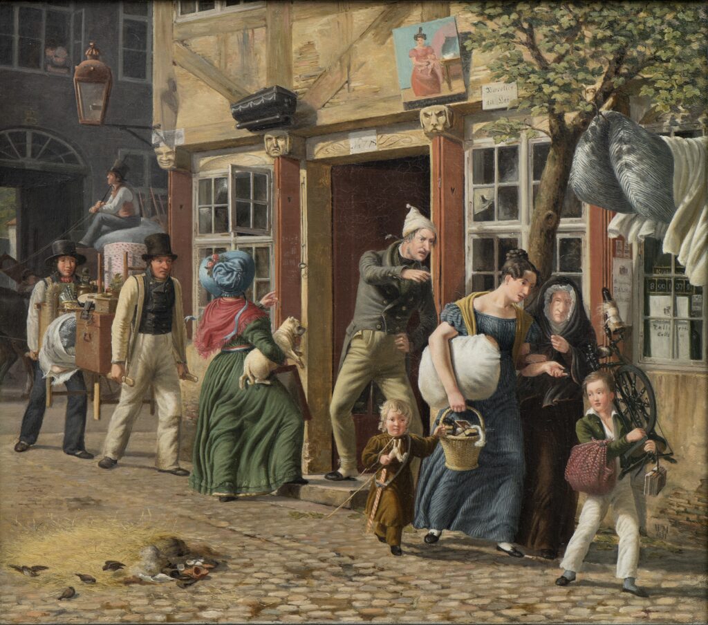 Knap 300 år senere malede Wilhelm Marstrand en bister husvært, der har smidt en familie med børn ud af deres lejlighed for at gøre plads til en langt mere velhavende kvinde med en velnæret hund under armen.