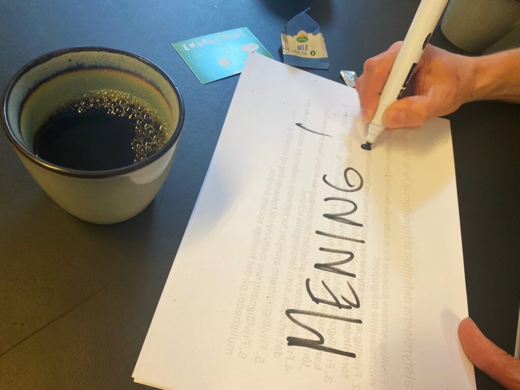 Det fortæller Peter Søndergaard, der er leder af Frivilligcentret i Fredensborg Kommune. Da han sagde ja til at give en kop kaffe og snakke om ét enkelt ord, valgte han ”mening”. Denne skribent havde ellers foreslået ordet ”motivation” eller det modsatte, ”apati”, men Peter Søndergaard skrev tilbage med ordene ”jeg kan meget godt lide ordet mening”.