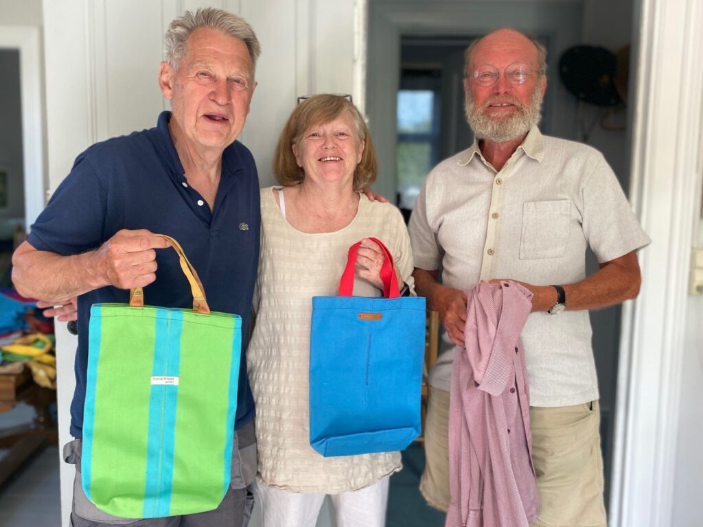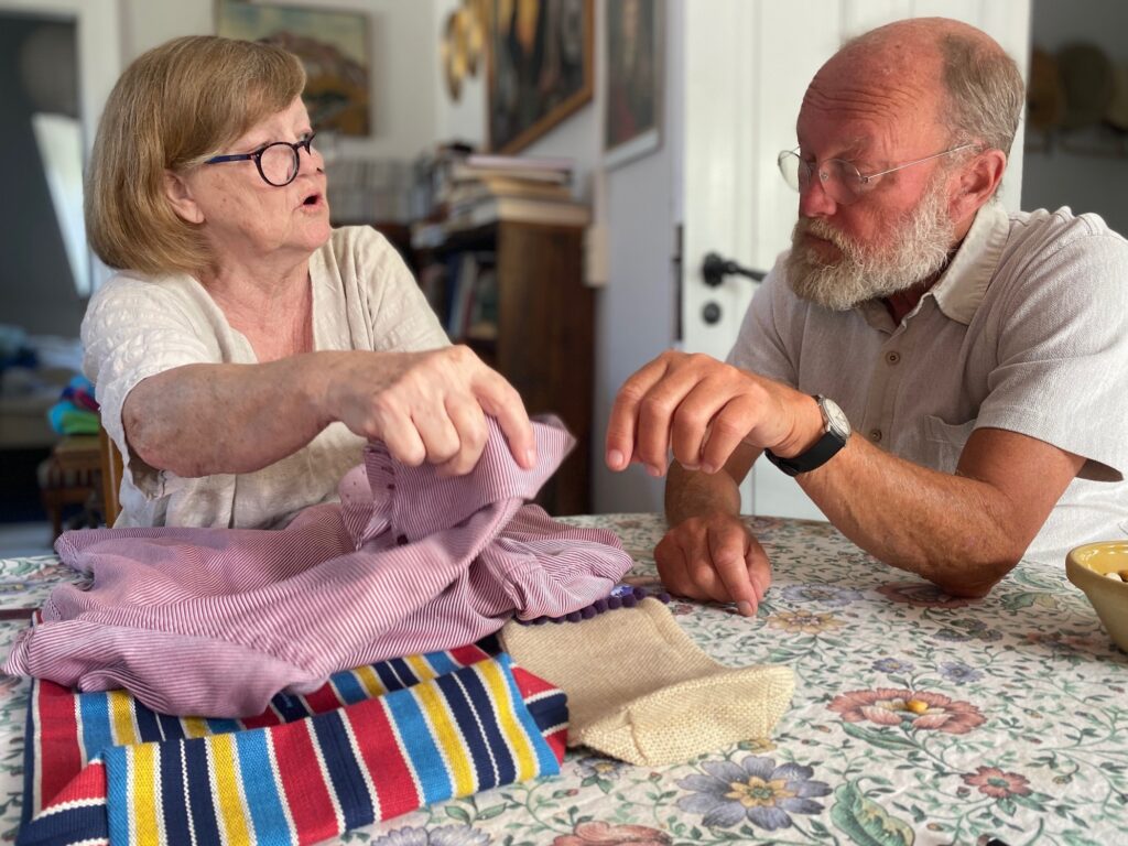Ja, det er endda bæredygtigt, forstået på den måde, at selvom Lone Gad laver tingene ved sine symaskiner i hjemmet i Athen, er alt lavet af stof, som hun har i overskud. Og når hun, Gorm eller Niels alligevel er i Danmark eller Grækenland, fyldes de sidste ledige rum i kufferterne med vinposer eller fx de fine punge, som Lone Gad i de seneste år har syet til boden på slotsmarkedet. Overskuddet går til Røde Kors.