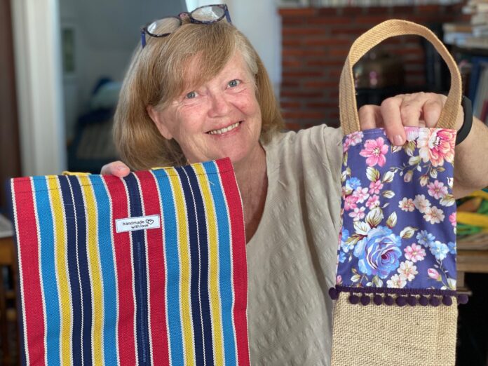 Hun syer med stof, som hun har i overskud fra tidligere projekter og stof, som hun får foræret. Det kan også være tøj, der ellers skal smides ud. Da hun her i juni besøgte Gorm Tortzen, var en af de medbragte punge lavet af mørkeblåt hessian og resterne af en gammel nederdel.