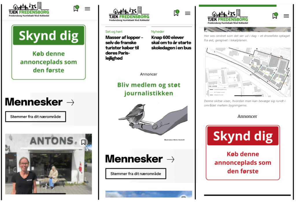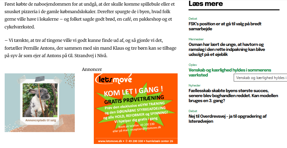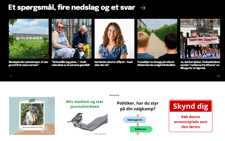 Og sidst – men absolut ikke mindst, er der temablokkene, der ligger under de fem emneord nyheder, politik, mennesker, debat og lokalhistorie. Her vises annoncer altid på desktop, 25 procent på mobil. Prisen er 200 kroner + moms per uge.