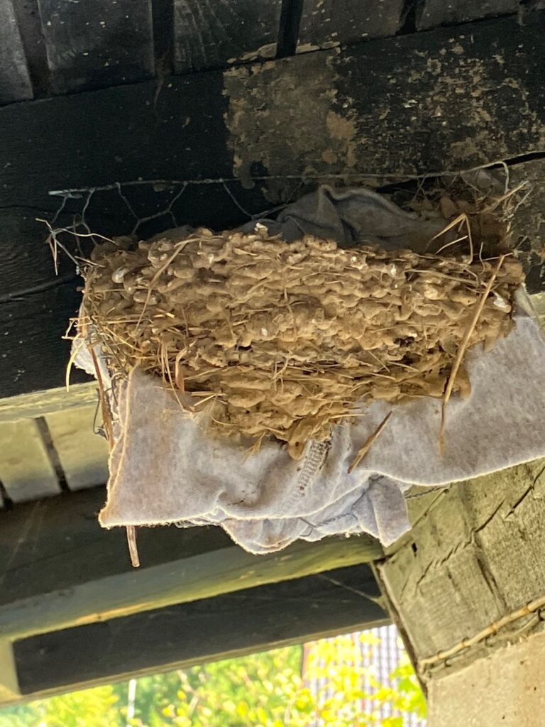 ”Jeg foldede et stykke kyllingenet som en lille skål med høj bagside, satte den op med et par kroge og lagde klude i. Så kom ungerne op i den nye rede. Og det lykkedes! Forældrene fortsatte fodringen, ungerne blev flyvefærdige og forlod hjemmet.”