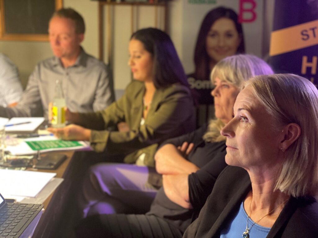 Maj Grundtvig Theander (M), der her sidder forrest, fremhævede partiets erhvervspolitik og fokus på bedre styring af store projekter. Bag hende sidder LA’s Helle Abild Hansen, der er godt inde i Norfors høje affaldstakster og kunne prikke til selskabets bestyrelsesmedlem Thomas Lykke Pedersen med fakta om, at ikke alt skyldes EU. Foto: Steffen Slot