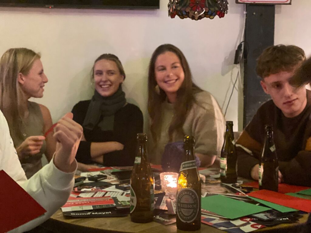 Bordene var godt fyldt op med Wiibroe og Carlsberg på flaske, og fra baren lød det munter ”Vi har ikke tillid til politikere, der ikke drikker”, og der sad et særligt ungdomsbord med førstegangsvælgere, som undervejs rakte en hånd i vejret med røde og grønne kort. Klokken var lidt i 20.00, da den pæne tone krakellerede for første gang.