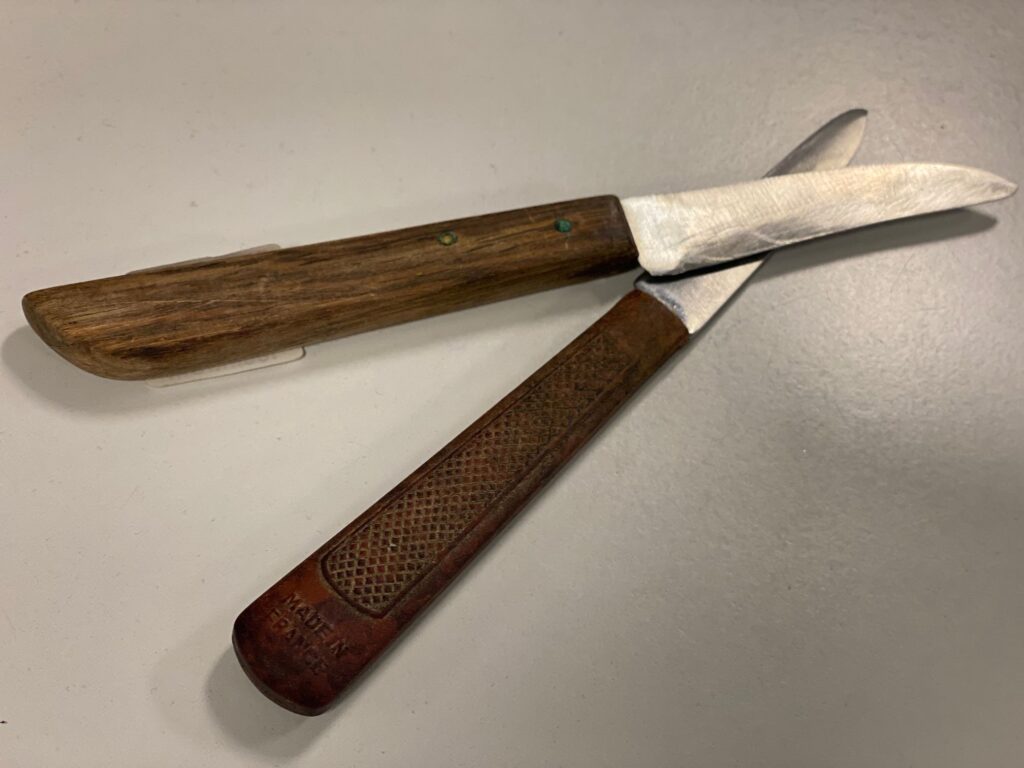 Jacob Brick kommer farende rundt om hylderne for at rode en ekstra gang i plastikkassen med køkkenknive, hvor han har fundet to små grøntsagsknive med fransk knivblad.