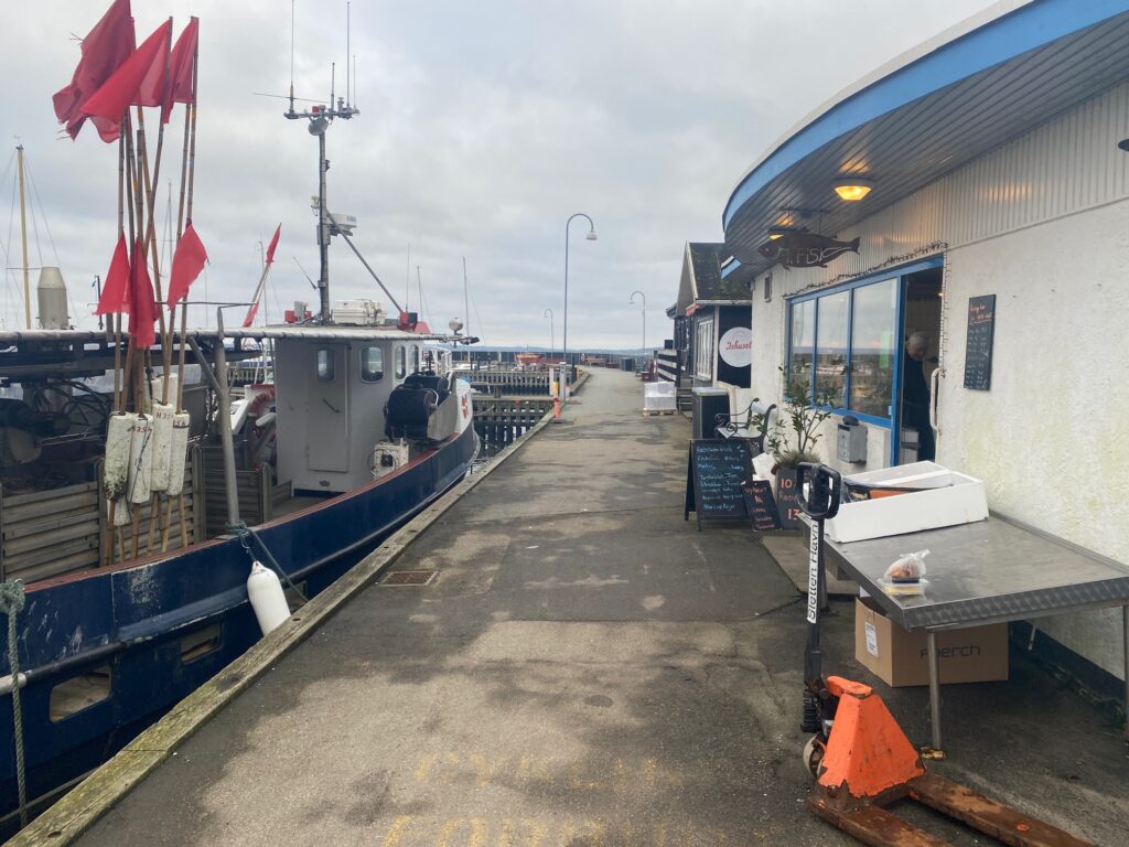Denne mandag den 22. december har Jesper Lund været en anelse stresset, fordi et nyt system med dankort-betaling pludselig drillede. I disse dage står kunderne i kø også uden for butikken for at købe rødspættefileter. Udsigten er den sydvendte disk med fisk og den aktive fiskekutter, der ligger ved kajen mod nord i Sletten Havn.