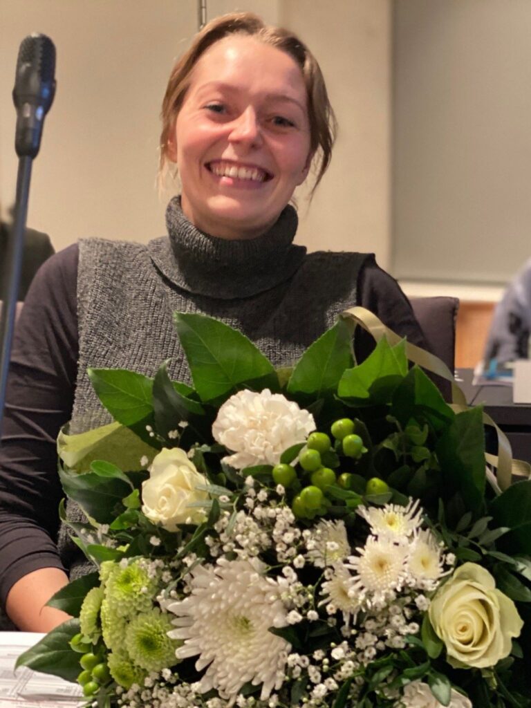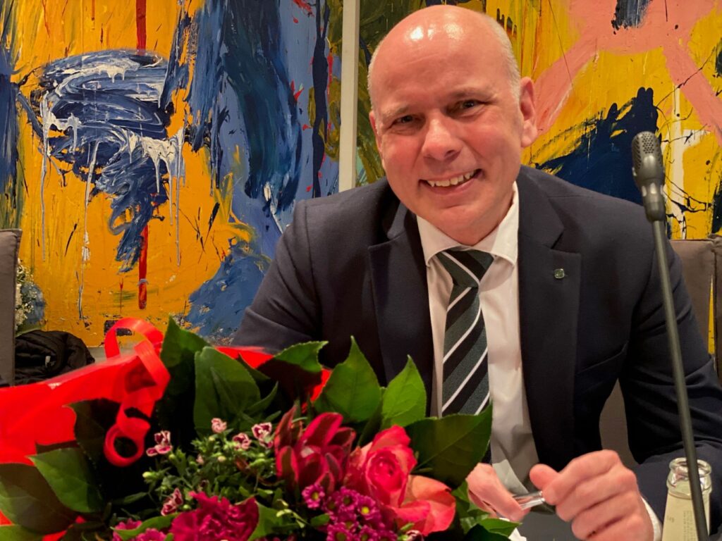 Mikkel Dodt Fregerslev, nyvalgt byrådsmedlem for Konservative, fik en buket med røde blomster – og partiet er jo også med i konstitueringen… Han får plads i Økonomiudvalget og Udvalget for Natur, Miljø og Bæredygtig Udvikling. Foto: Steffen Slot