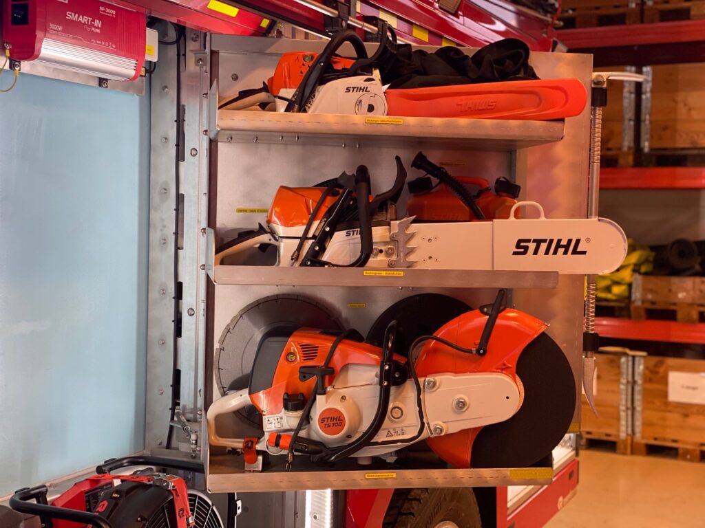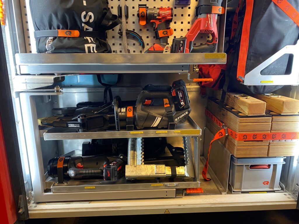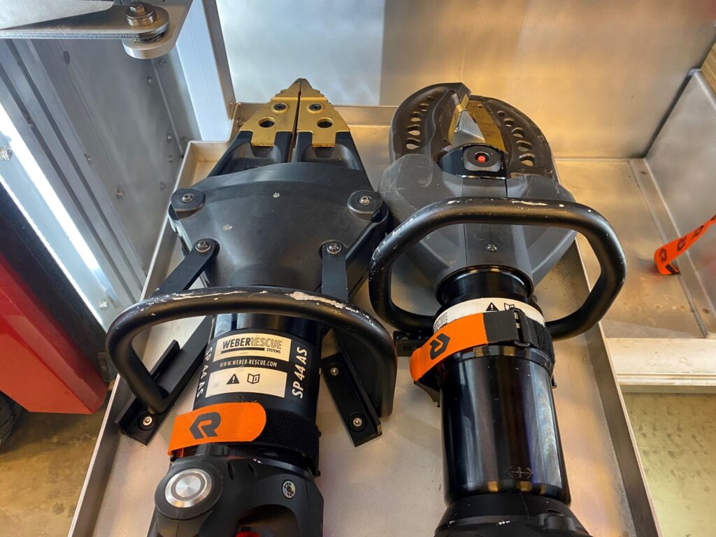 På hylden over selve værktøjet ligger ekstra batterier, og det er blot en af mange smarte funktioner i de fem nye autosprøjter, som Nordsjællands Brandvæsen har fået igennem de seneste år.
