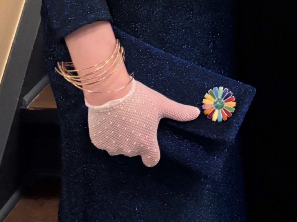 –  Jeg har lånt en halskæde, der er virkelig flot med stykker af rav, plastik og et stykke af en dåse. Det er ment som en kunstnerisk kritik af det aftryk, vi sætter på jorden. Jeg har også lånt en broche med verdensmålene, hvor planeten er i centrum, fortæller Marianne Bigum og fortsætter: