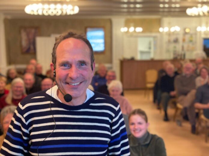 – Så behøver vi jo ikke gøre noget, udbrød en herre i salen på en aften, hvor Karlebo Kro var indhyllet i en snestorm, og hvor foredraget ganske kort var startet i den muntre ende.
