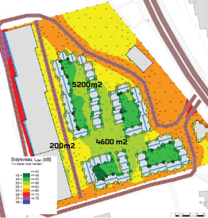 Hele området balancerer meget tæt på at være på den forkerte side af grænseværdien på 58 dB, selv med alle de krumspring, der kan gøres for at få støjen dæmpet på friarealerne og i selve boligerne.