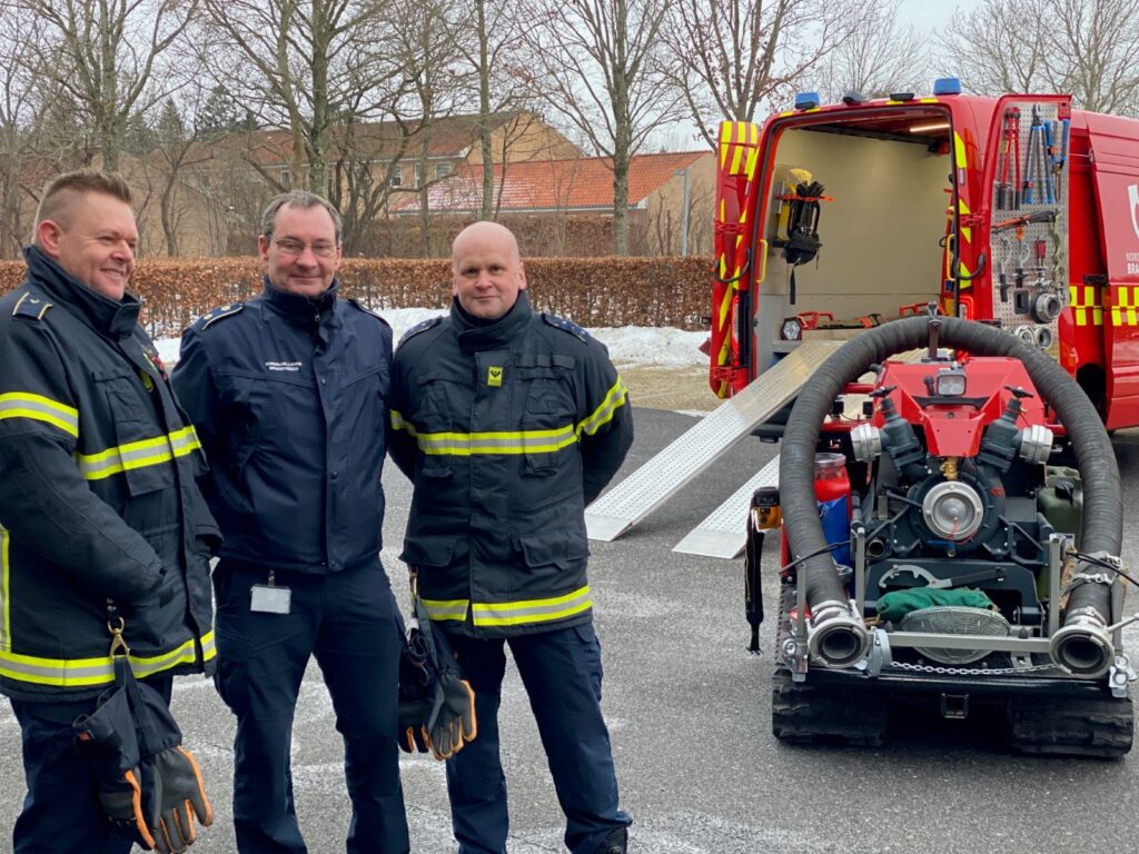Førhen skulle de med håndkraft skubbe efterløberpumpen ned til søen eller dammen. Nu sender Nordsjællands Brandvæsen den fjernbetjente crawler afsted mod nærmeste sted med vand, der kan pumpes op.