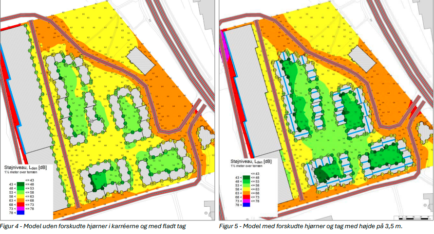 Her ses resultatet af beretningerne for et byggeri med flade tage og med en taghøjde på 3,5 meter. Med flade tage bliver friarealerne for støjplagede, viser beregningerne.