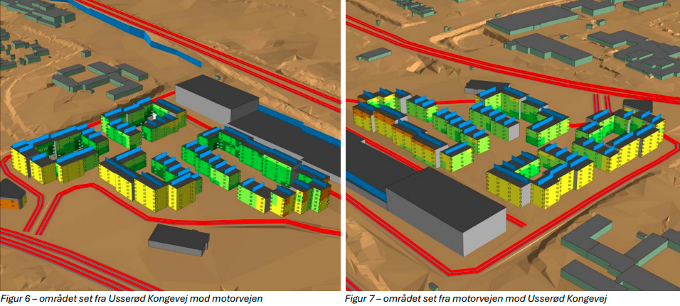 De gule facader er de steder, der rammes af støj over 58 dB. De grønne facader holder sig under. De blå flader på tagene markerer behovet for en taghøjde på 3,5 meter for at reducere støjen på friarealerne.