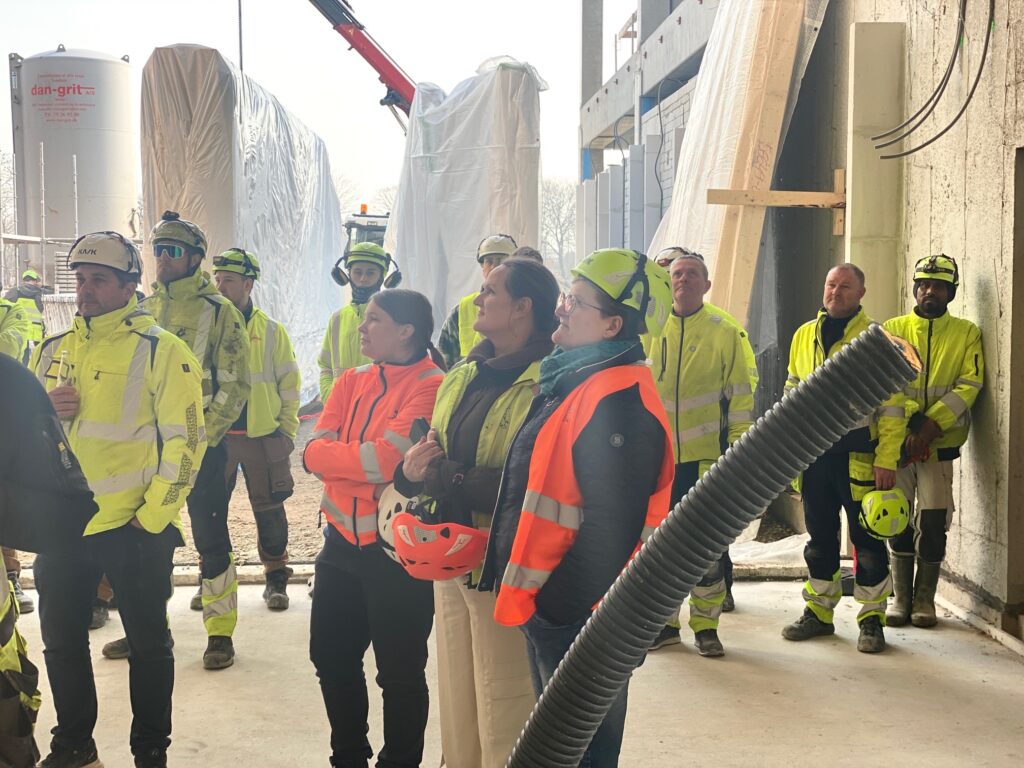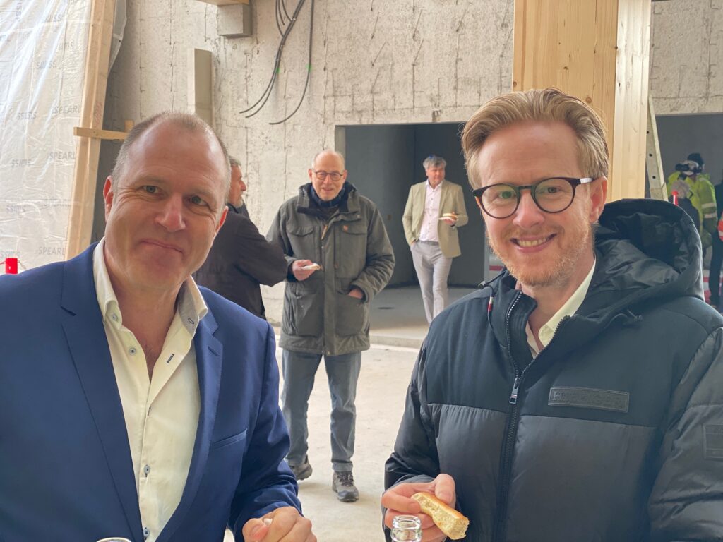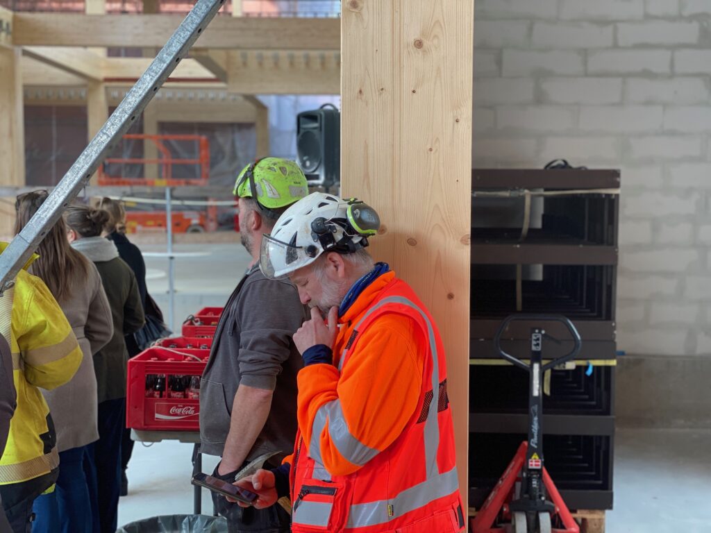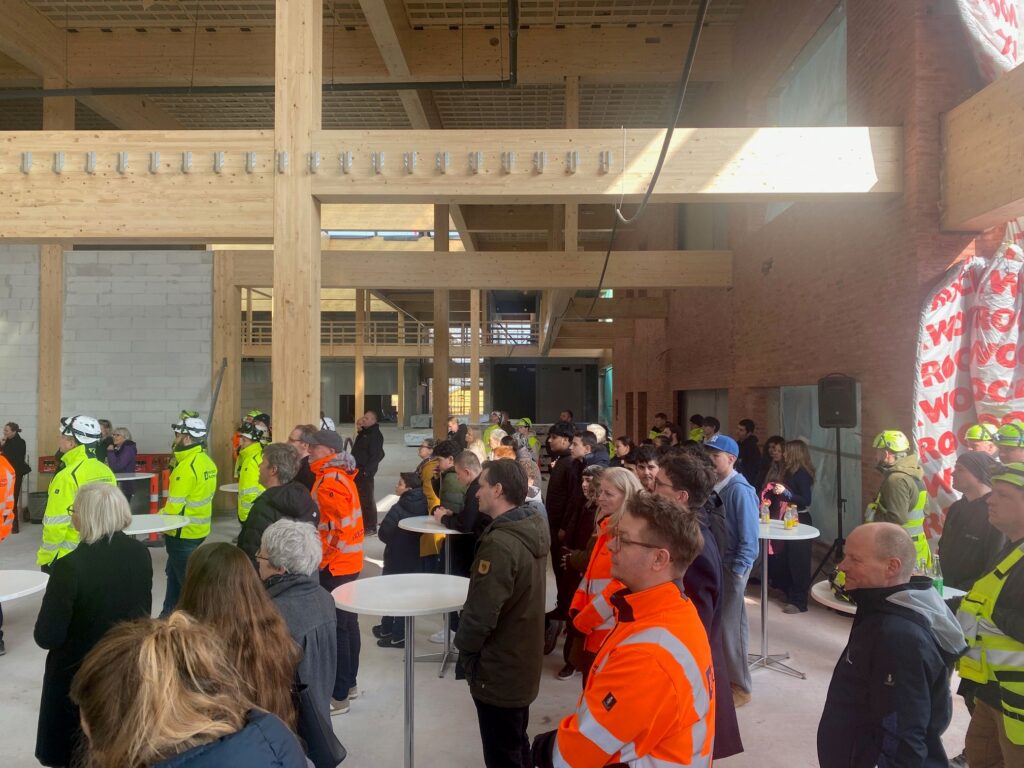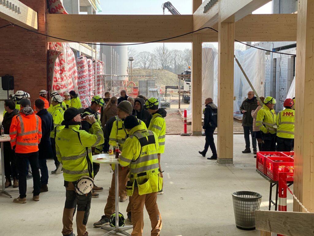 Betonarealerne i Generationernes Hus var tirsdag fyldt af glade håndværkere til rejsegilde i et vejr, som de ikke just har været vant til de seneste måneder: Sol og et pust af forår.